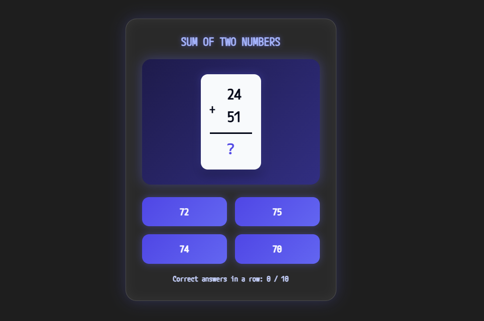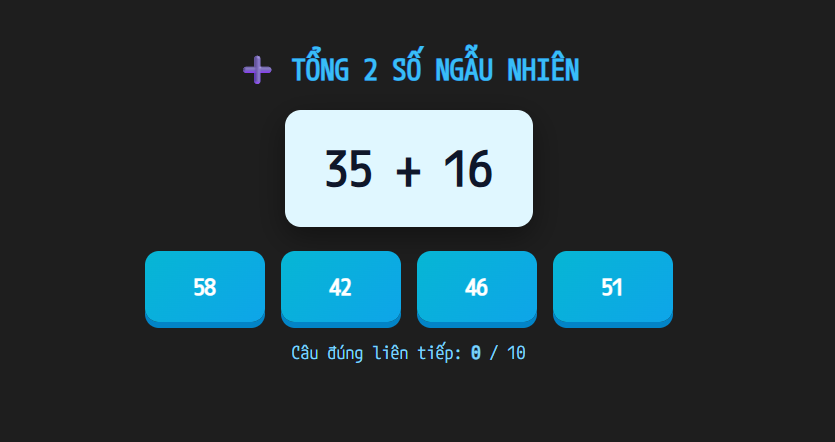 Chơi game Tổng 2 Số Ngẫu Nhiên giúp luyện phản xạ toán học. 10 phép tính liên tiếp, chọn đáp án đúng để chiến thắng ngay!