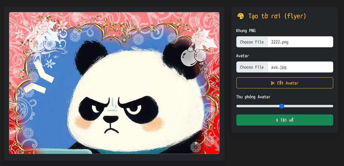 Công cụ tạo flyer online miễn phí, giao diện nền đen hiện đại, chỉnh sửa nội dung trực tiếp. Dùng ngay trên web, không cần cài đặt, xuất file chất lượng cao chỉ trong vài phút